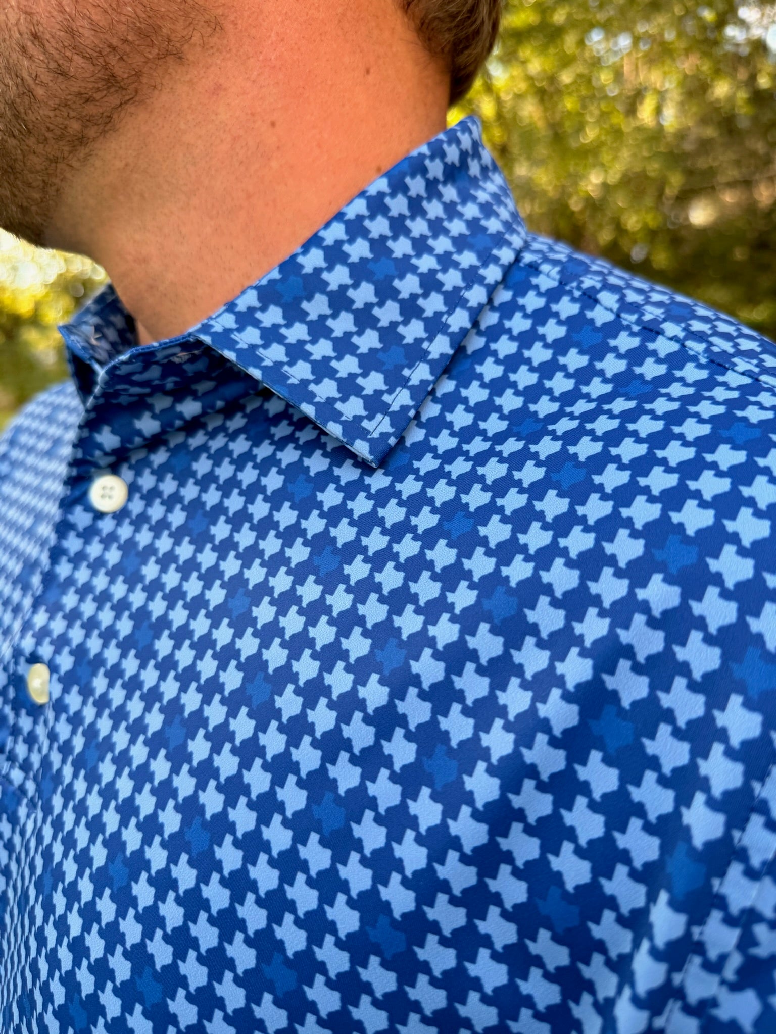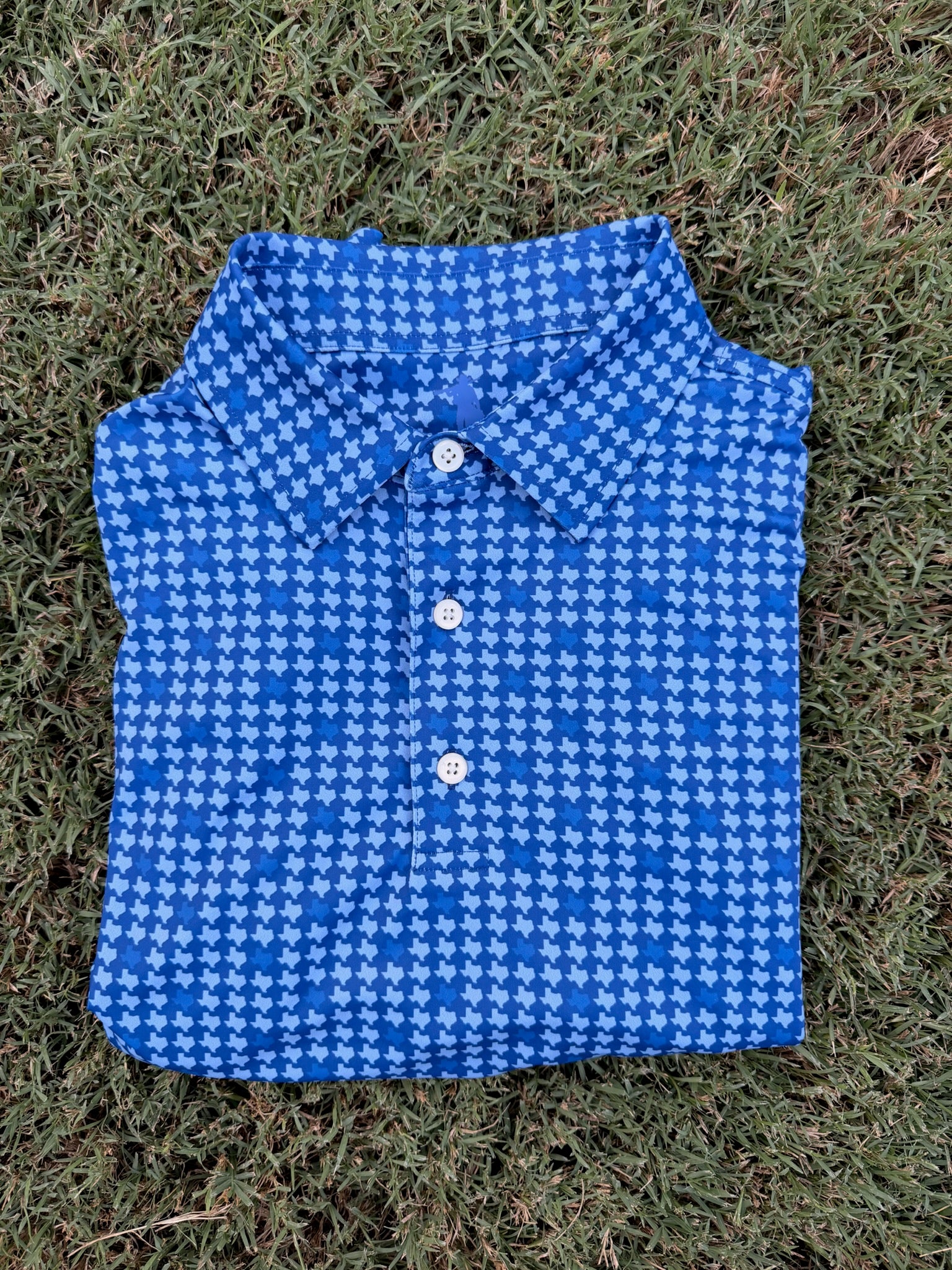 Stand tall in Texas style with the “Caprock” Polo. Featuring an all-over Texas silhouette pattern on a bold navy base, this polo is a tribute to the rugged beauty of the Lone Star State.