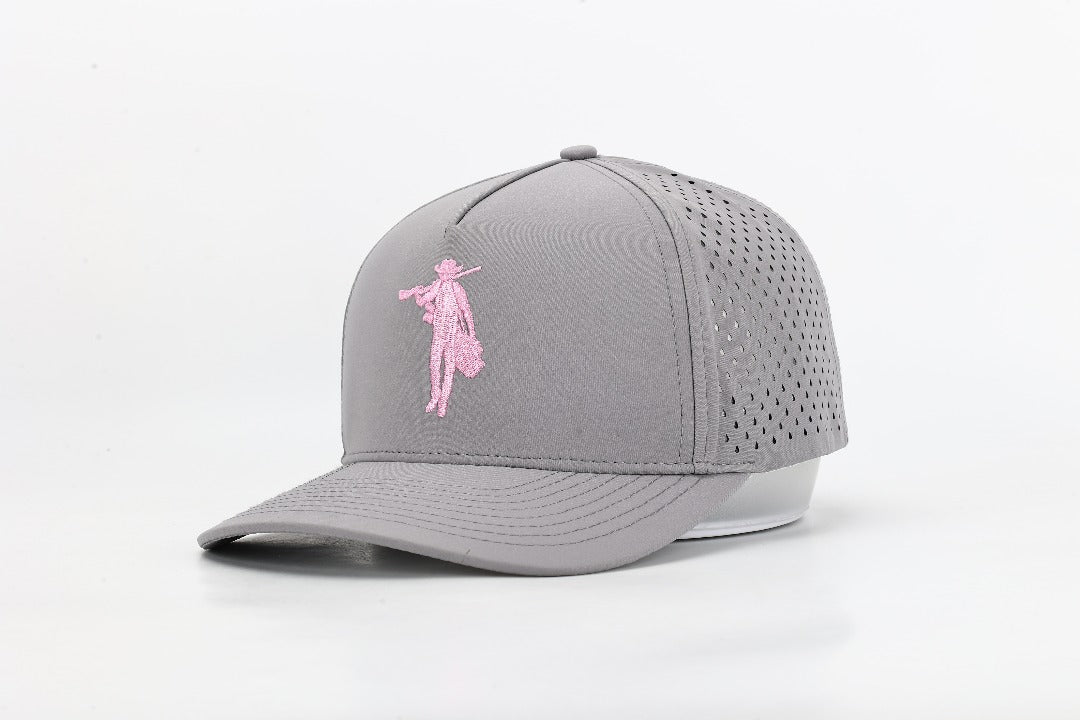 Meet the "Cool Pink" hat by Thomas Adams Apparel — where subtle confidence meets everyday performance. This lightweight performance cap features a soft gray base, laser-cut ventilation for breathable comfort, and a bold pink embroidered walking golfer logo that makes a quiet statement.