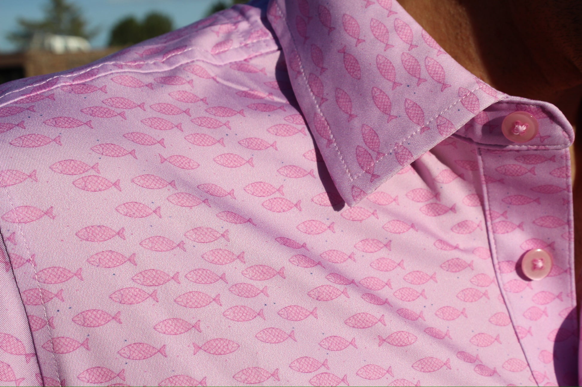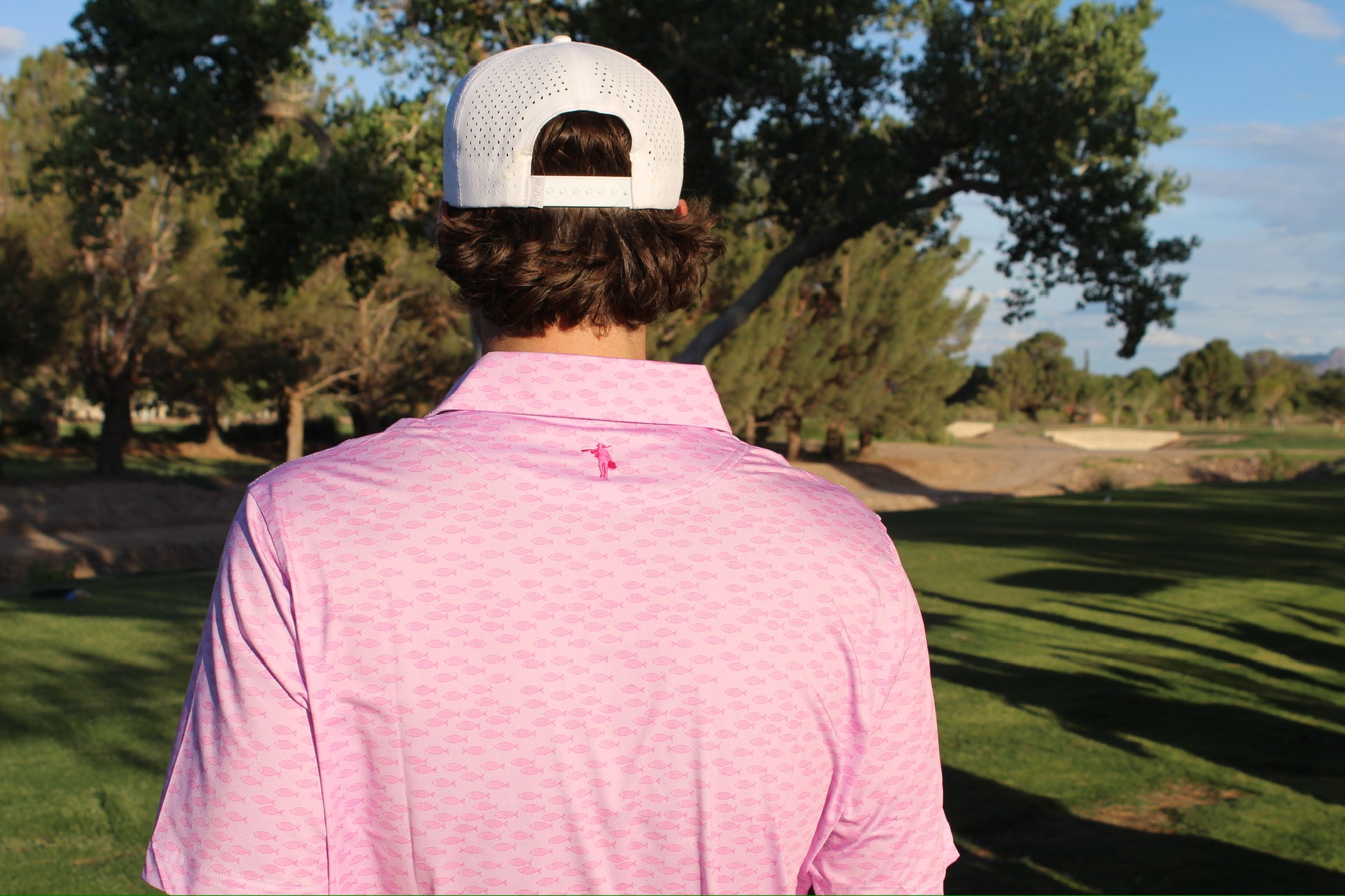 Make waves in the "Pink Tides" Polo — a lighthearted blend of beach-day vibes and technical performance. Designed in a playful pink-on-pink fish pattern, this polo captures coastal cool while delivering the comfort and mobility you expect from Thomas Adams.